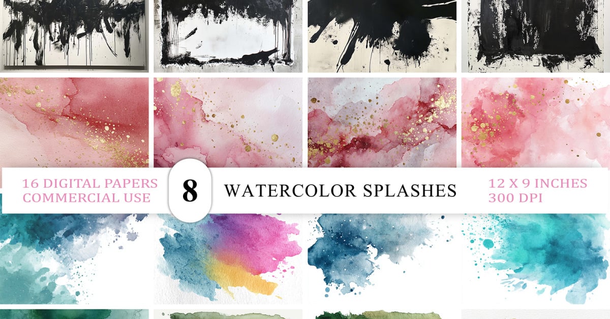 This pack includes 16 Abstract Ink & Watercolor Splashes Bundle digital papers/backgrounds.