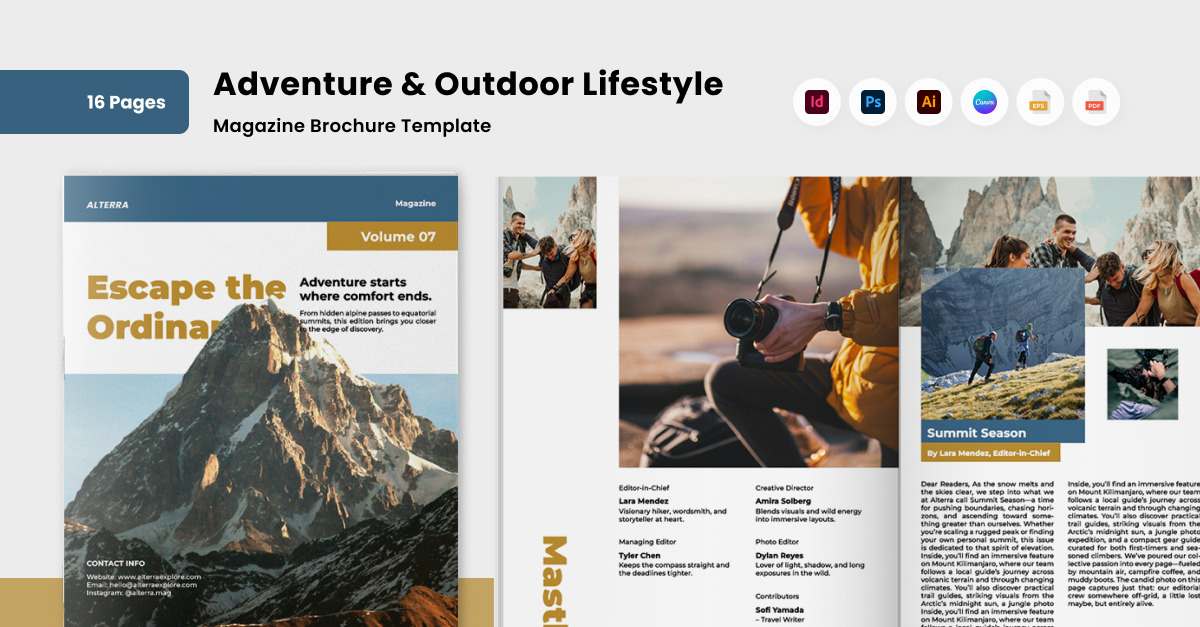A stunning editorial layout designed for outdoor and adventure publications. With modular grids and visual storytelling, it’s perfect for brands showcasing travel stories, gear, and experiences in bold, immersive visuals.
