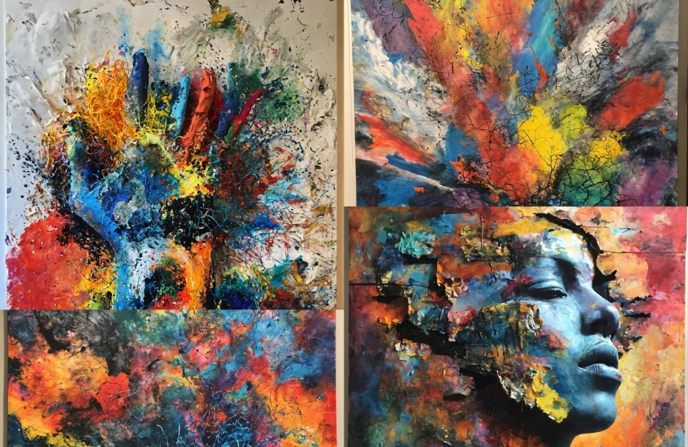 Welcome to a mesmerizing journey through digital creativity! This stunning AI-generated artwork represents the beautiful collision between human imagination and artificial intelligence. Each piece in this four-panel collection tells a story of explosive creativity – from the dynamic hand reaching through swirling colors to the serene profile emerging from a kaleidoscope of hues.